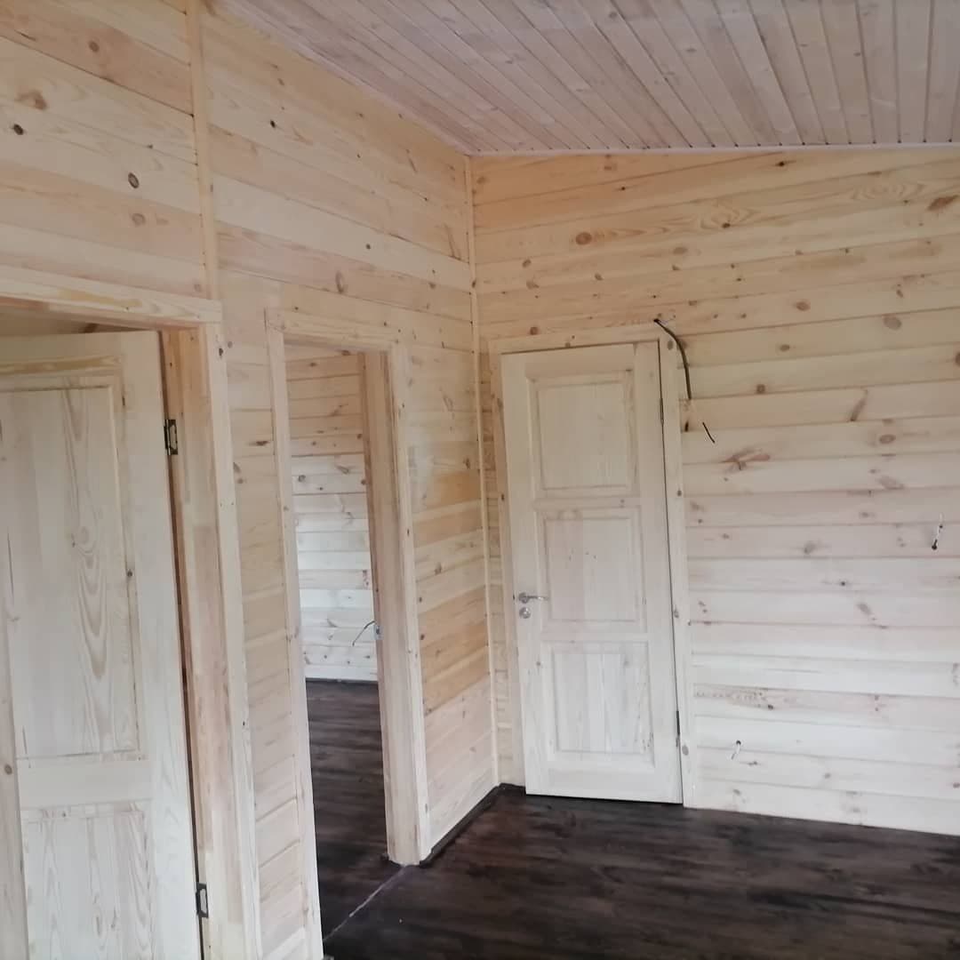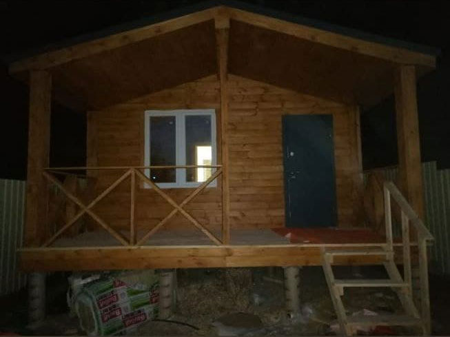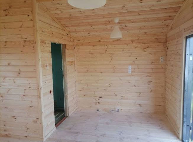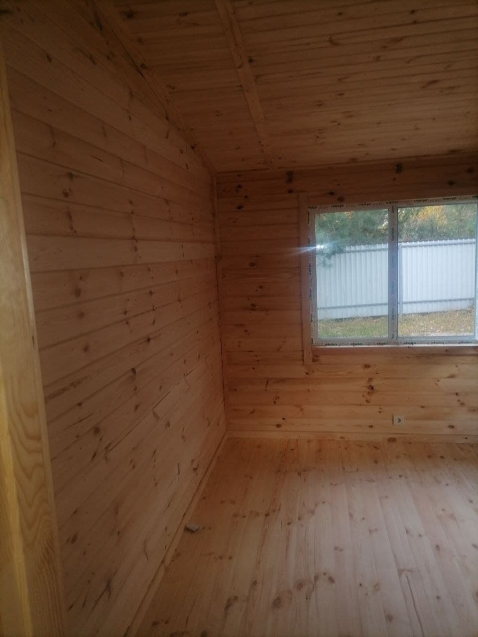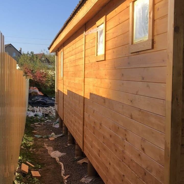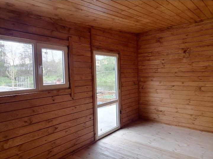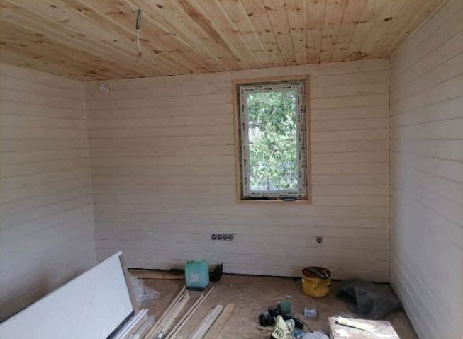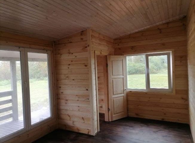 Утеплювач 150 мм закладається в готовий каркас, зовнішній фасад обшивається вітро-гідро мембраною та фальшбрусом 20 мм, внутрішне оздоблення також фальшбрус.